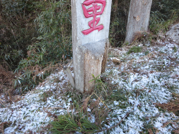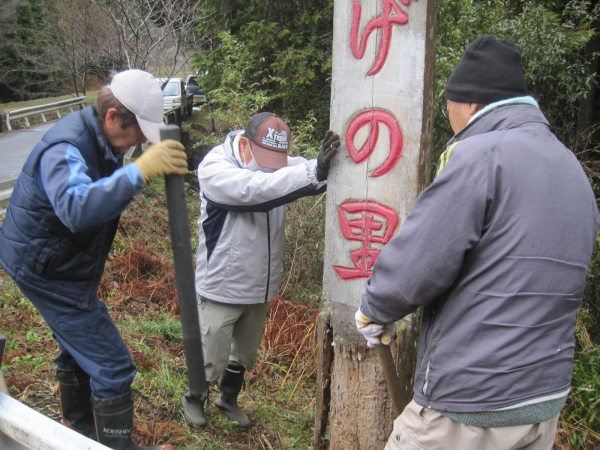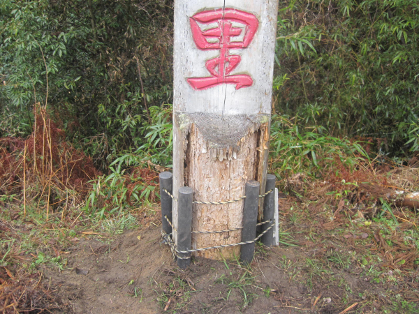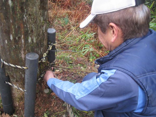 真っ直ぐに建て直し、傾かないように杭で補強し、ロープで固定しました。