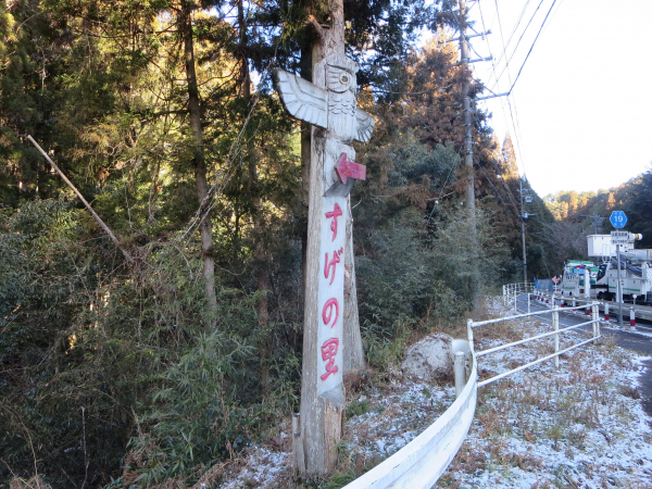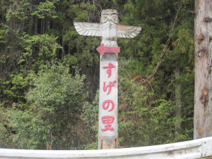 足助方面から国道153号線新盛交差点を左折し、県道19号土岐足助線を約700mのところに「案内人」のトーテムポールがあります。